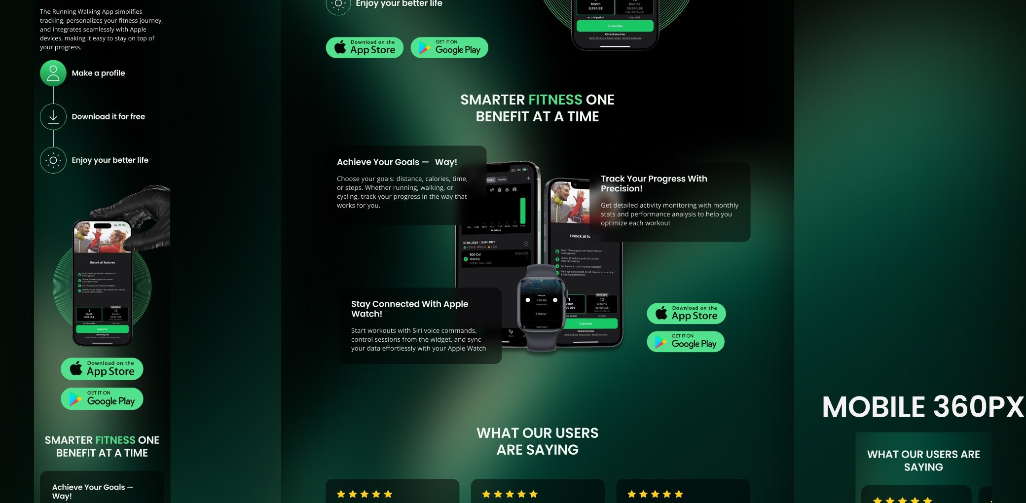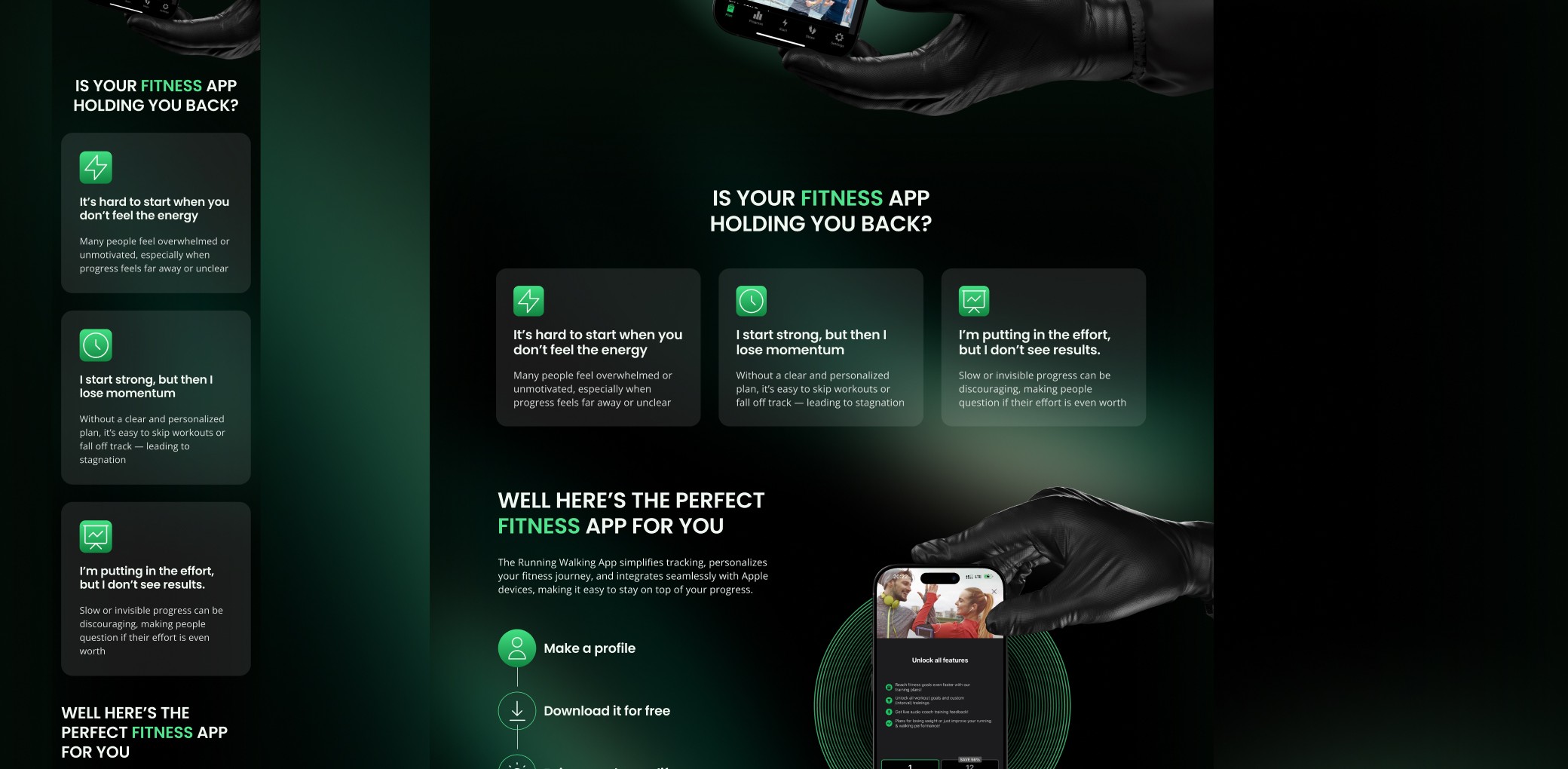 The main challenge was presenting the app’s core features in a way that is both visually engaging and easy to understand for new users. The landing page needed to quickly communicate the value of the app, guide users through the main benefits, and encourage them to download or sign up. Another challenge was maintaining a balance between a modern, energetic fitness style and a clean layout that keeps the interface intuitive and not overloaded with information.